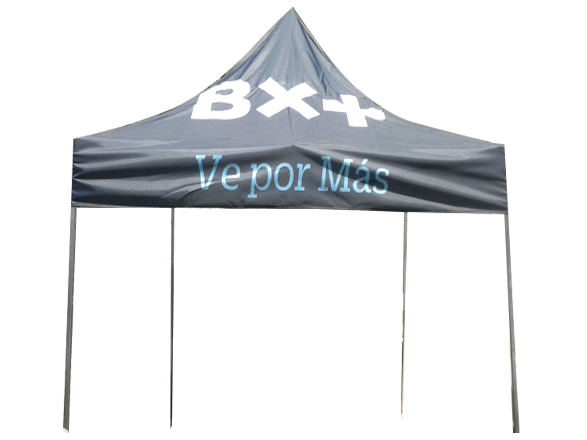 Carpa de 3x3m con estructura expandible de tubo cuadrado de acero galvanizado de alta resistencia para uso rudo. Con toldo de 4 gajos, y juego de 3 paredes confeccionados en lona de 13oz impresa a 720dpis o tela tiburón sublimada, a escoger.